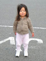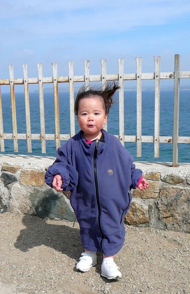 ↑ 予想外に風が強く 寒かったので ダディのフリースを 着ています♪丘から降りて、ビーチに辿り着きました。