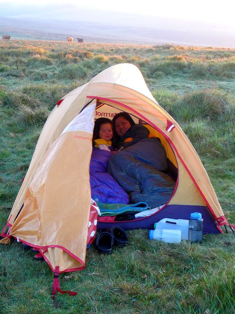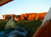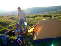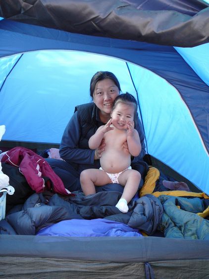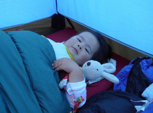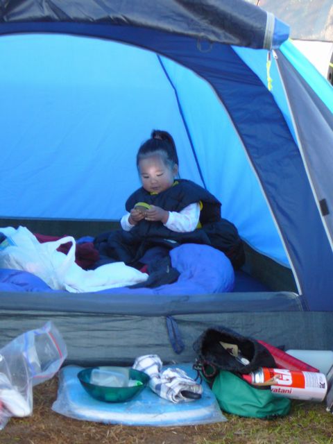 ↑ お食事中、失礼します♪ワタシ達はと言えば、ピグちゃんをテント内の寝袋に入れてから ワインを開けて パテやら スモーク・サーモンやらで 酒盛り(爆)。。。 と 言っても 二人ともカナリ疲れていたので 二人して ワインのボトルを半分空けただけで スグに 寝る事にしちゃいました。