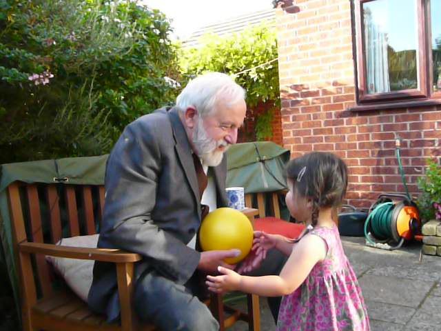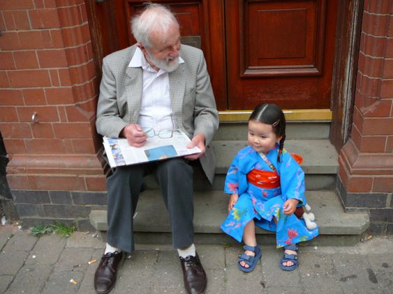 ↑ 「ぎゃんだ (grandad) も すわるぅー」 と 銀行の外に無理やり座らせる♪フード・フェスティバルな割に そこで食べる物として提供されているのは (産地やら 品種はともかく) 普通にバーガーとか そんな物ばかりだったので、とりあえず ピグちゃん用に ジャケット・ポテトを買い 食べてもらいました。